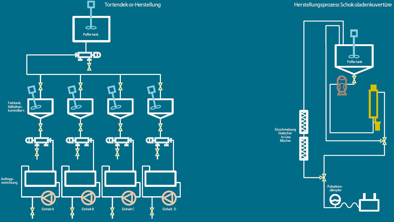 Keine überraschung: Mit CIP-Systemen kann man wertvolle Zeit sparen. Und die Qualität ist immer dieselbe. Auf das Produkt zu achten ist wichtig. Doch es kommt auch auf die Technik an. Viele fruchtbasierte Komponenten bei der Herstellung von Süßwaren sind sauer oder enthalten abrasive Stoffe. Temperaturkontrolle ist entscheidend. Zutaten auf Cremebasis verderben schnell. Bei einer unbeabsichtigten Kristallisation kann es zu unhygienischen Produktansammlungen in Leitungen und Tanks kommen. Die Abwasserbehandlung ist integraler Bestandteil in der Nahrungsmittelproduktion. Unsere Lösungen können sowohl Exzenterschnecken-, Druckluftmembran- oder Schlauchpumpen, als auch Mischer, Filter, Mühlen und Muncher beinhalten. |