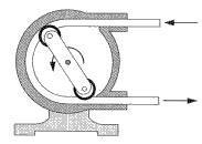 • VANE PUMP: In an eccentric rotor slots are placed containing movable vanes. By springs or centrifugal force these vanes are pressed against the rotor housing. Due to rotation chambers are formed sucking in and pumping fluid. Not applicable for flows containing solids. Wear particles can also contaminate the flow. A pump with ellipse shaped rotor holding only one vane is suitable for products with high viscosity.