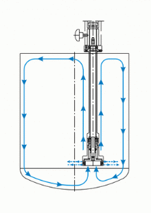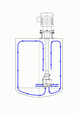 tank. When the "Jet" hits the bottom, the flow divides into two streams, which are deflected upwards to mix the whole batch. Mixing the product does not induct air either by vortexing or by the mixing shaft itself. All vessel contents, whether high or low viscosity, are mixed homogeneously and product transfer occurs over all liquid strata in the vessel. Unlike conventional mixing systems the product mass does not rotate in the vessel so no baffles are required in the tank. Heavy sediments are suspended and homogeneously distributed without strong turbulence. Jet mixers reduce heat input to the product, 99% of the energy is transferred directly into motion.