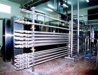 This is basically the same as the tubular heat exchanger. The only difference is that the wall of the inner tube is being scraped all the time, so no crust can be formed on the wall. This is a great advantage when honey is cooled.