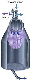The honey is sprayed into a vacuum chamber. Vapour and gases rise to the top of the chamber, while the product falls down. Through a condenser at the top, all the water, vapour and volatile products are being condensed and fall back into the product, while the non-condensable gasses are removed from the product. At the bottom the honey is released.
