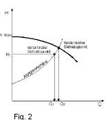Haben wir nun für eine Anlage die Fördermenge Q festgelegt und die Förderhöhe H berechnet, so erhalten wir den Anlagen-Betriebspunkt. Dieser liegt meist nicht auf der Q/H-Kennlinie der Pumpe. In Abhängigkeit von der geforderten Förderhöhe sucht sich die Kreiselpumpe ihren Betriebspunkt selbst auf der Kennlinie im Schnittpunkt von Anlagen und Pumpenkennlinie. Die Fördermenge steigt von Q1 auf Q2. (fig. 2)