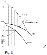 Bei der Reihenschaltung von Kreiselpumpen addieren sich die Förderhöhen bei entsprechendem Förderstrom zu der gemeinsamen Pumpenkennlinie (- - -). (fig. 8)