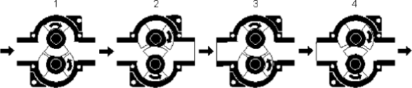 The increasing cavity between the rotors on the suction side is filled with the product. The product is displaced in a circumferential direction and discharged on the pressure side as the cavity between the rotors is collapsing. This generates a constant flow from the suction to the discharge side of the pump.