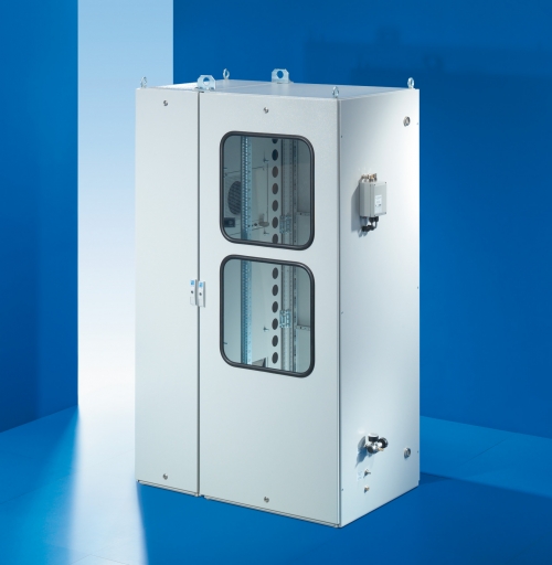 Deze innovatie bestaat uit een schakelkastcombinatie uit de TS 8-serie in de afmetingen 1200 (800+400) x 2000 x 800 mm (BHD). De elektronische componenten worden ingebouwd in het 800 mm brede kastdeel. Het andere, met een gemodificeerde scheidingswand afgezette 400 mm brede kastdeel biedt ruimte voor de koelapparatuur. Voor een flexibele en veelzijdige afbouw kunnen de kasten worden voorzien van montageplaten, 19“-profielen en systeemchassis.