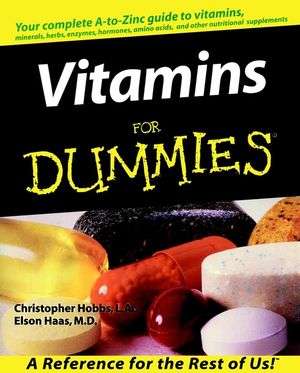“Christopher Hobbs and Elson Haas...take a complicated field and...make sense of it.” —Ron Lawrence, MD, PhD, Director, Council on Natural Nutrition Don’t forget to take your vitamins! It’s good advice. But everybody’s needs are different. Age, lifestyle, gender, ethnicity, diet, and habits all play a role in determining which vitamins and minerals you need more or less of in your diet. Like traffic lights, vitamins help regulate your body’ most basic functions at the cellular level. And just like those red, green and amber beacons, they must be synchronized—not too many or too few—to get you through your life’s journey in good shape. Now Vitamins For Dummies shows you how to have green lights all the way. Confused by vitamins? Mystified by minerals? Can’t tell the difference between gingko and ginseng? In this straight-talking guide, two experts cut through the confusion and help you: Get a handle on what each vitamin mineral and supplement does Create a personalized supplement program Understand the fine print on the labels Combat or prevent specific ailments Enhance memory, mood, and energy Slow the aging progress Drawing upon their years of experience in clinical practice as well as the latest scientific research into nutritional supplements, Chris Hobbs and Elson Haas, MD, tell you, in plain English, what you need to know to make informed decisions about which supplements you take. They cover: The ABCs of vitamins All about minerals Amino acids and proteins—the body’s building blocks The importance of fats and oils Common supplements for digestion Super-foods and other great supplements The top 40 herbal supplements As an added bonus, Vitamins For Dummies features a quick-reference, A-to-Z guide to treatments for 90 common complaints. From acne to motion sickness to varicose veins, the authors describe complete healing programs that include vitamin, mineral and herbal supplements and lifestyle changes. Your complete A-to-Zinc guide to vitamins, minerals, herbs and other nutritional supplements, Vitamins For Dummies is your ticket to good health and long life.