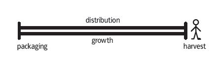 If we look to the chain again, we can see there are many stages in which nothing productive is happening (indicated in blue). Each time goods are hauled into a vehicle, production stops and the goods enter hibernation mode until they reach the next production point, or the consumer. Products are created in order to be consumed and anything we do outside of production or consumption is merely an indirect enabler, a means but not an end.