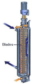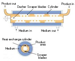 This is basically the same as the tubular heat exchanger. The only difference is that the wall of the inner tube is being scraped all the time, so no crust can be formed on the wall. This is a great advantage when honey is cooled.